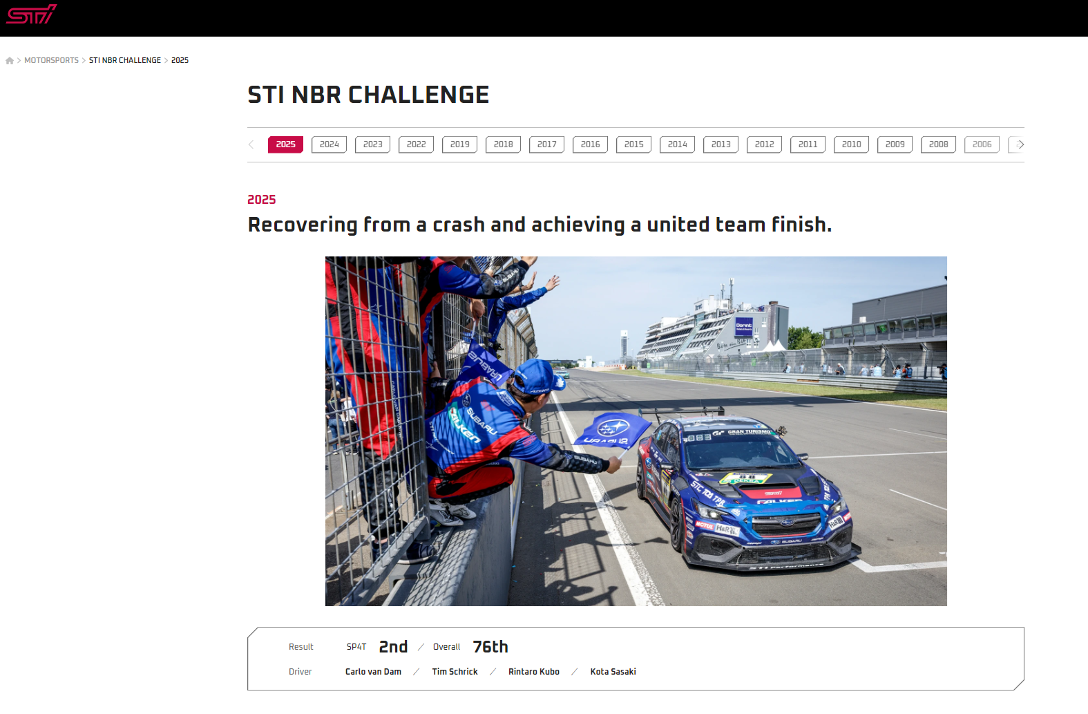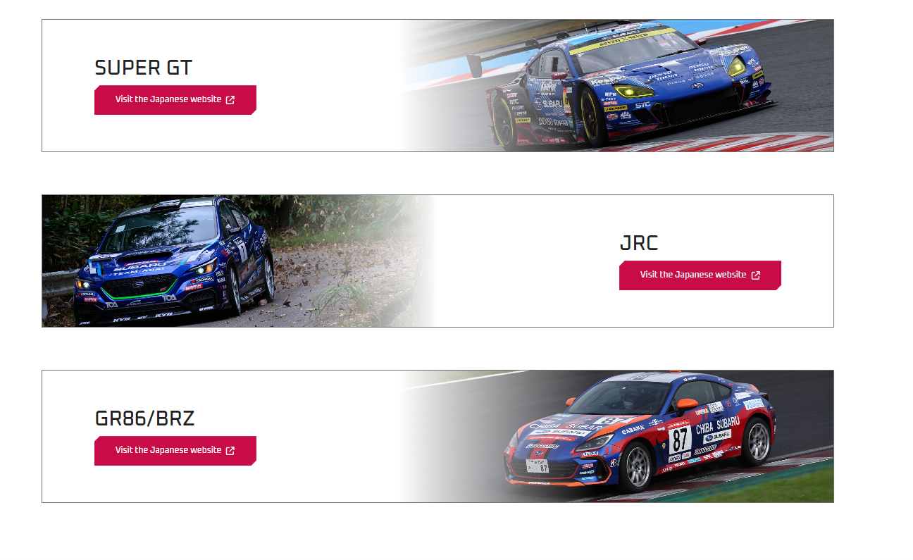 STI has launched a renewed page highlighting our motorsports activities. On this page, you can explore year‑by‑year results and race highlights from the Nürburgring 24-Hour Race, where STI continues to take on new challenges, along with photos, videos, and detailed specifications of the historic race cars. We also introduce our activities in the SUPER GT, JRC, and GR86/BRZ races held in Japan (information on SUPER GT, JRC, and GR86/BRZ links to Japanese pages). We hope you will continue to support STI in our ongoing motorsports challenges!